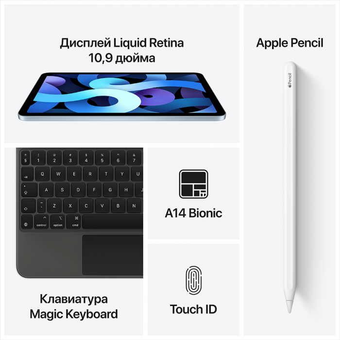 Полностью обновлённый iPad Air стал ещё более универсальным. Он оснащён великолепным дисплеем Liquid Retina 10,9 дюйма с широким цветовым охватом. Фотографии, видео и игры выглядят на нём живо и естественно вплоть до мельчайших деталей.1 Процессор A14 Bionic с системой Neural Engine, использующий самые современные технологии машинного обучения, располагает достаточной мощностью, чтобы вы могли монтировать видео 4K, создавать красивые презентации и заниматься 3D‑моделированием. И всё это легко и быстро. Кроме того, теперь iPad Air поддерживает клавиатуру Magic Keyboard и Apple Pencil (2‑го поколения).2 Технологии Touch ID и Apple Pay позволяют быстро и безопасно разблокировать устройство и делать покупки. А ещё в вашем распоряжении камера 12 Мп на задней панели и камера FaceTime HD 7 Мп, разъём USB‑C для подключения аксессуаров и питания устройства, аккумулятор, заряда которого хватает на целый день3, быстрая связь по сетям Wi‑Fi 6 и 4G LTE Advanced.4 С iPad Air ваши идеи будут блестяще реализованы.