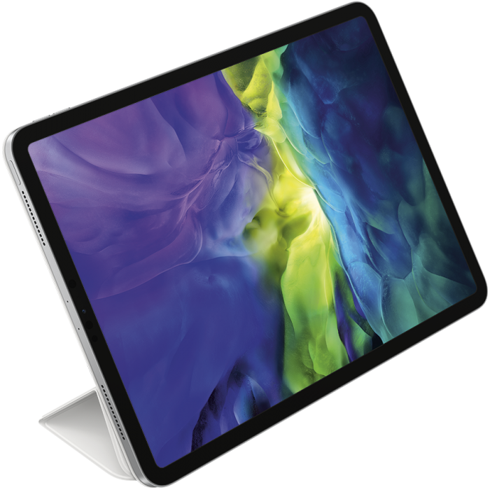 Обложка Smart Folio для iPad Pro изготовлена из цельного листа полиуретана и защищает устройство с обеих сторон. Она автоматически выводит iPad Pro из режима сна при открытии и возвращает в него при закрытии. Вы можете быстро сложить обложку Smart Folio несколькими способами, чтобы превратить её в подставку, с которой удобно читать, смотреть, печатать или звонить по FaceTime.