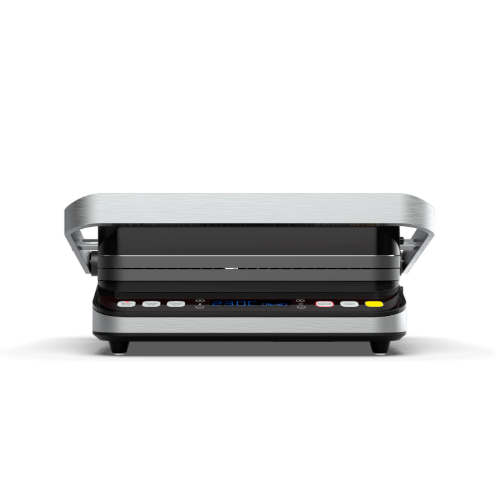 2000 Вт, 3 режима нагрева - верхний гриль, нижний гриль, разморозка обоих грилей, максимальный угол открытия -180°, регулировка температуры, таймер, съемные двухсторонние пластины, размер пластины 320*220 мм