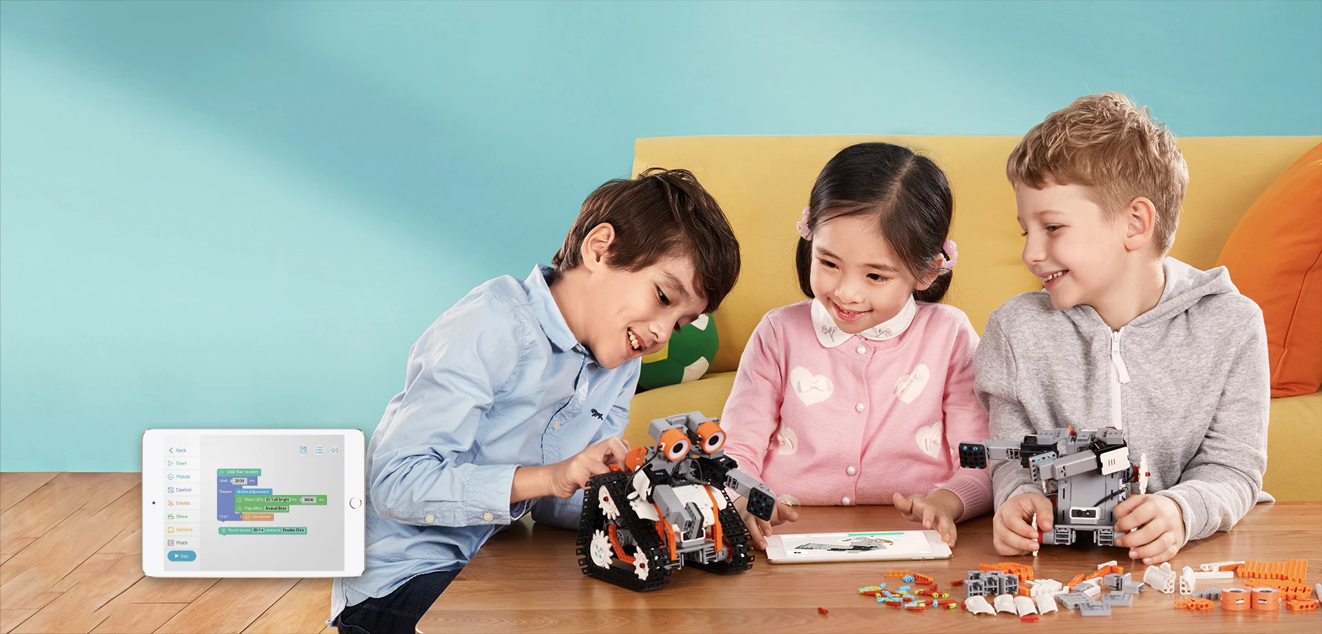 Программируемый редактор перетяни и вставь на основе блоков позволяет пользователям всех уровней создавать индивидуализированные программированные последовательности. Программируй робота, чтобы научить его танцевать, играть, ходить и делать многое другое с помощью языка кодирования Blockly.