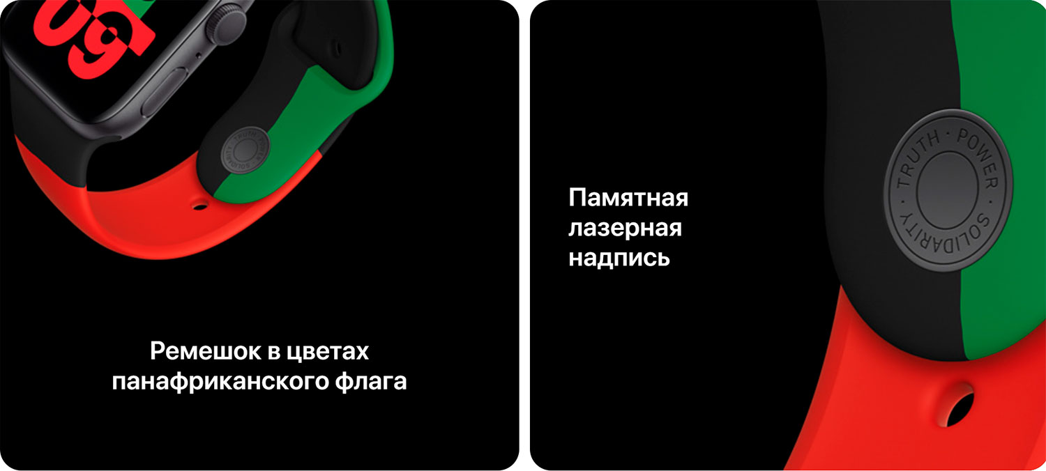 Спортивный ремешок Black Unity создан работающими в Apple представителями афроамериканской диаспоры и их единомышленниками, чтобы отдать дань уважения истории и культуре Чёрного континента. Он оформлен в цветах панафриканского флага и вдохновлён традиционным искусством лоскутного шитья. Три разноцветных элемента ремешка из фторэластомера собираются вручную и спрессовываются воедино. А при использовании динамического циферблата «Единство» для Apple Watch три цвета складываются в уникальные сочетания. Ремешок оснащён специальной застёжкой pin‑and‑tuck с лазерной надписью «Truth. Power. Solidarity».
